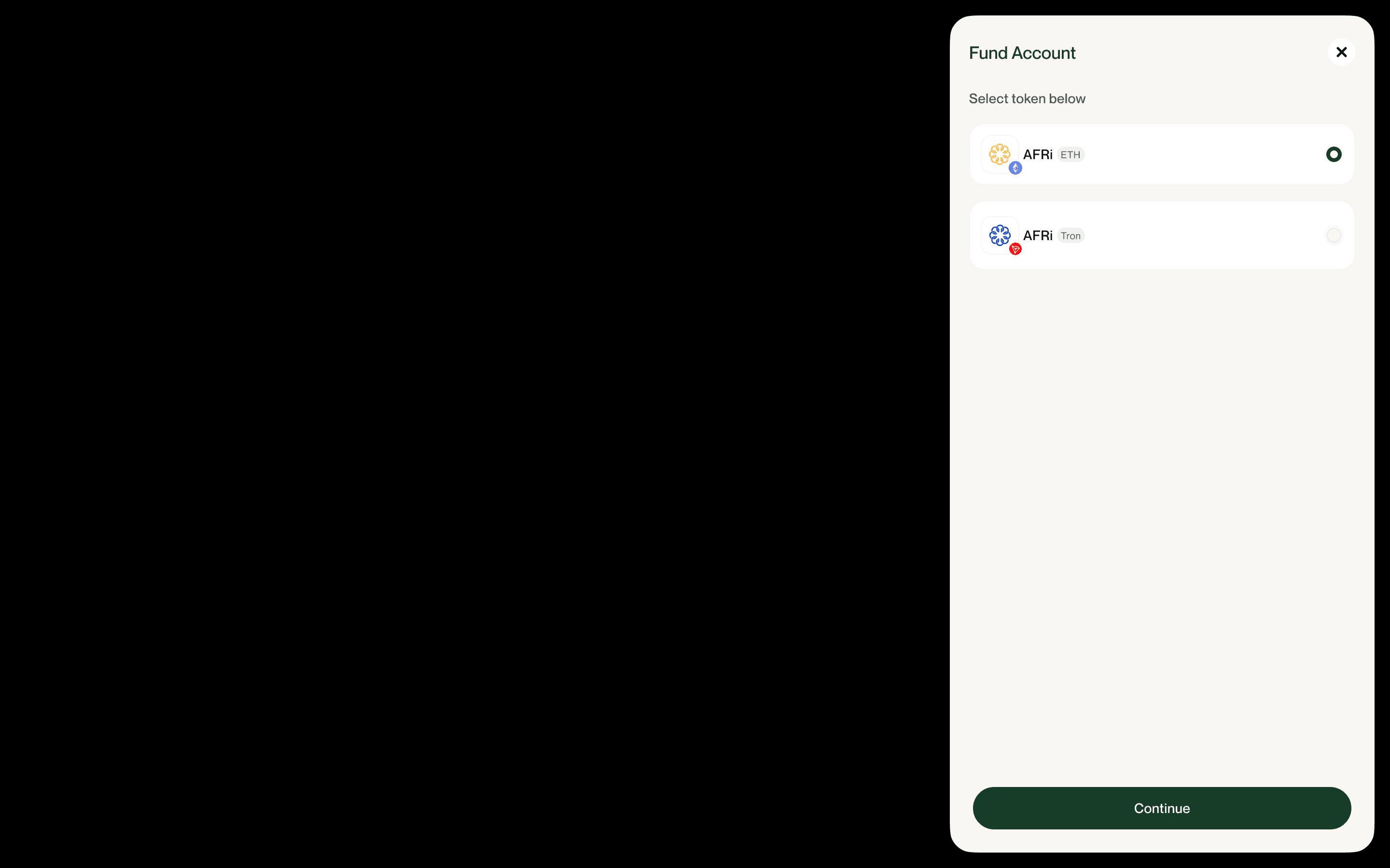 User selects token type to fund